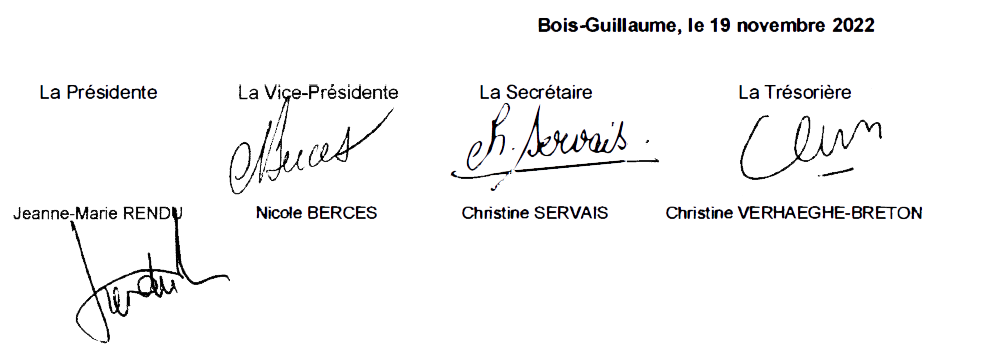 Conformément à la décision adoptée par le Comité directeur du 7 juillet 2022, son siège social est fixé chez : Madame Jeanne-Marie RENDU, Présidente, 297 rue Robert Pinchon – 76230 Bois-Guillaume.